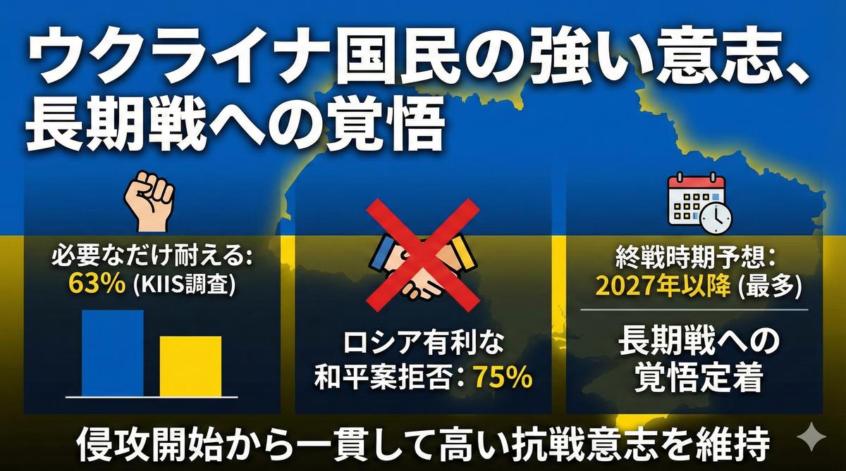 ・終戦時期予想は「2027年以降」が最多となり、長期戦への覚悟が定着している。