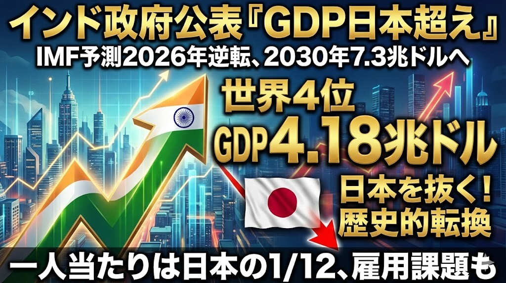 ・IMFの推計では公式な逆転は2026年(インド4.51兆ドル、日本4.46兆ドル)になると予測されている。