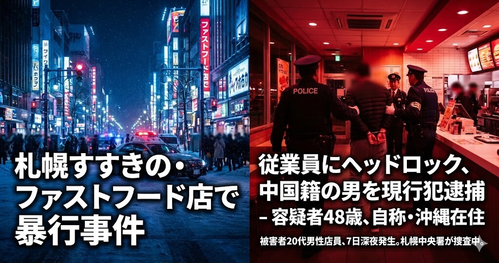 札幌・中央警察署は2026年1月7日、自称・沖縄県那覇市居住の中国籍の男(48)を暴行の疑いで現行犯逮捕した。男は同日午後11時前、札幌市中央区のファストフード店で、20代の男性店員の首を腕でつかみ、ヘッドロックをする暴行を加えた疑いが持たれている。