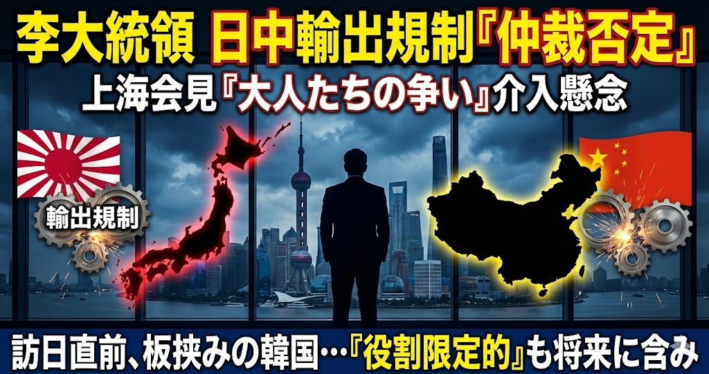 韓国の李在明大統領は記者会見で中国による日本への輸出規制に言及し、「争いに割り込むと両方から嫌われることがある」と述べ現段階での仲裁には否定的な考えを示しました。李大統領は7日、訪問先の中国・上海で会見しました。
