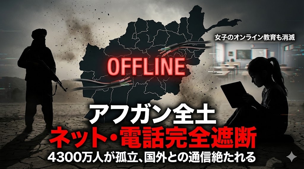 ・タリバンが「不道徳防止」を掲げ、アフガニスタン全土のネットと電話を完全遮断した。・4300万人以上が国外との通信を絶たれ、メディアや支援団体も連絡不能に。