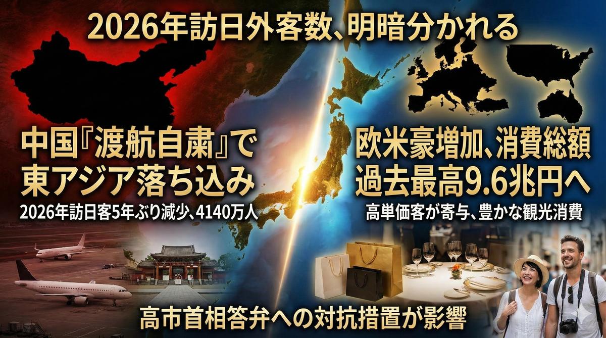 ・2026年の訪日外客数は前年比2.8%減の4140万人と5年ぶりに減少へ。・高市首相の台湾関連答弁への対抗措置として、中国が昨年11月から日本への渡航自粛を要請。