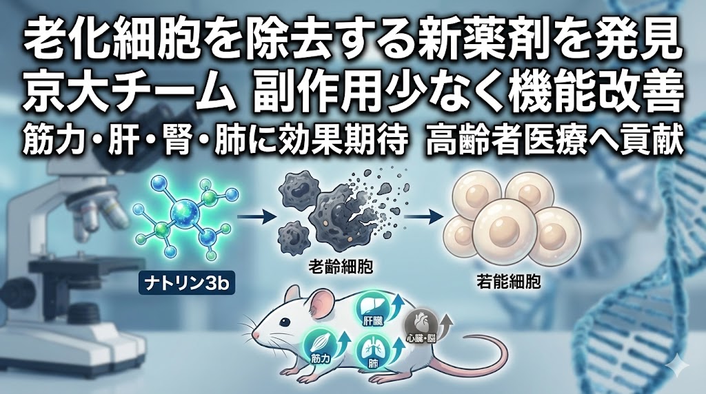 特に、既存の抗がん剤候補からこの効果を見出した点や、副作用が極めて少ないというデータは、実用化に向けたハードルを大きく下げるものだ。現在、抗老化薬(セノリティクス)の分野では米中などが巨額の予算を投じて熾烈な開発競争を繰り広げているが、こうした基礎研究の厚みで一歩先を行く成果を出せるのは、日本の地力の強さと言える。