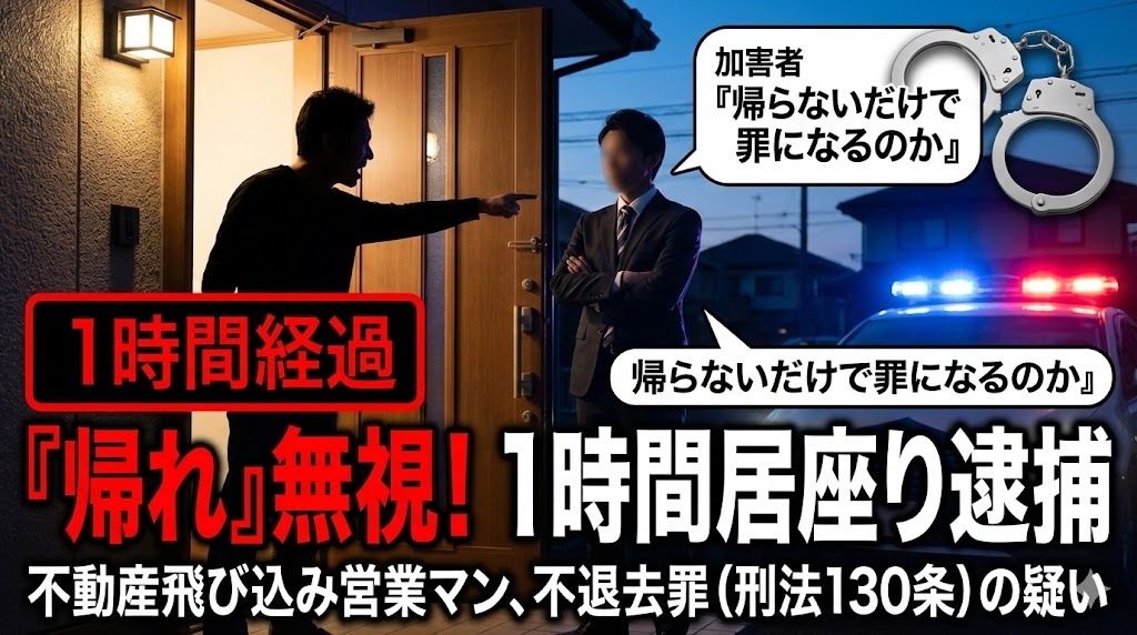 ・飛び込み営業の不動産社員が「帰ってくれ」と言われても1時間居座り逮捕。・近隣住民が言い合いに気づき、警察へ通報したことで事件が表面化。