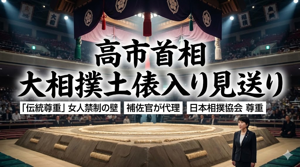 ・高市首相は、1月25日の大相撲初場所表彰式での土俵入りを見送る方針。・大相撲の「女人禁制」という伝統文化を尊重し、自らの登壇を控える判断をした。