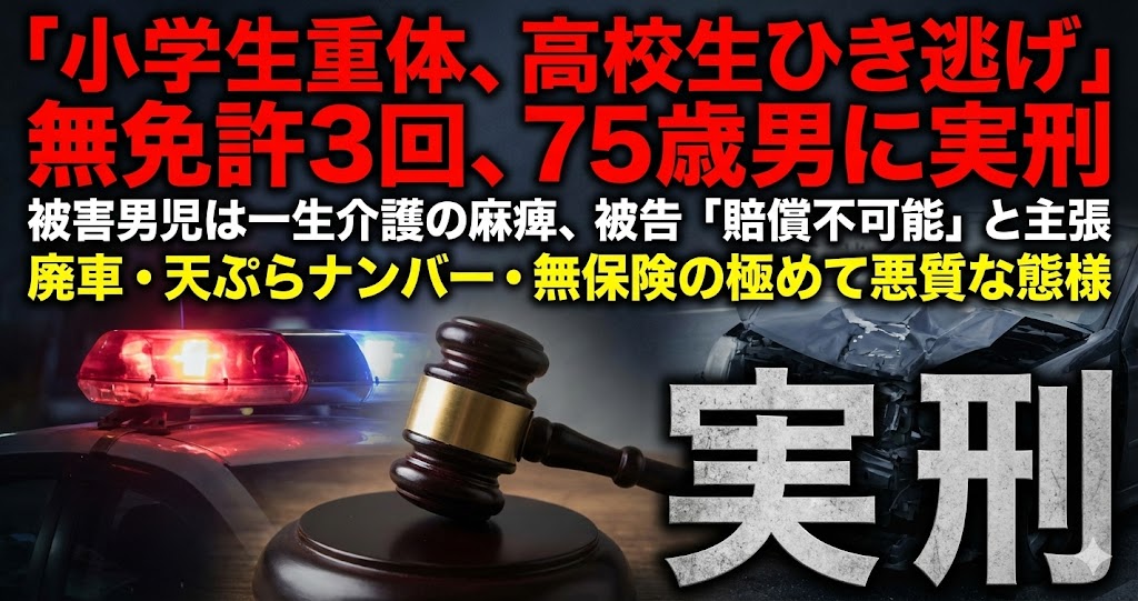 ・小学生を重体、高校生をひき逃げ、無免許運転を3度重ねた75歳男に実刑。