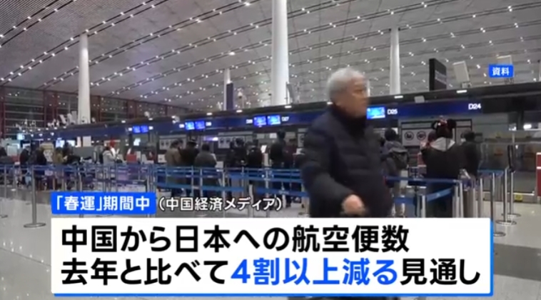 中国メディアは、今年の旧正月「春節」に伴う大型連休の移動期間「春運」において、中国から日本への航空便数が前年比で4割以上減少する見通しだと報じた。