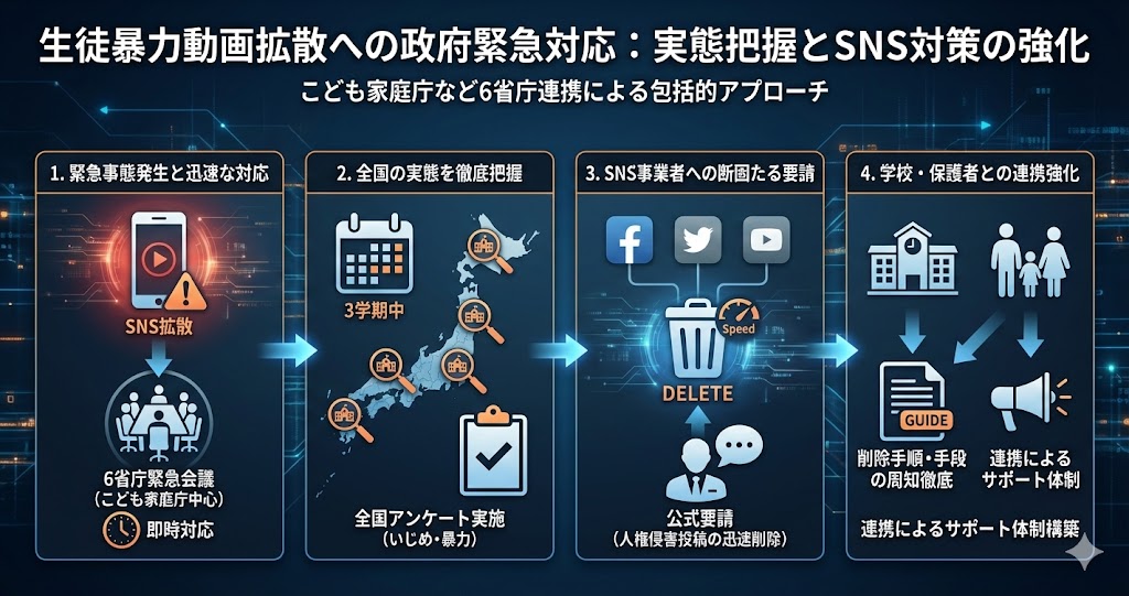 引用元: 政府6省庁が緊急会議、拡散広がる生徒による暴行いじめに動き出す「暴行動画のSNS投稿を速やかに削除せよ」SNS事業者に協力要請