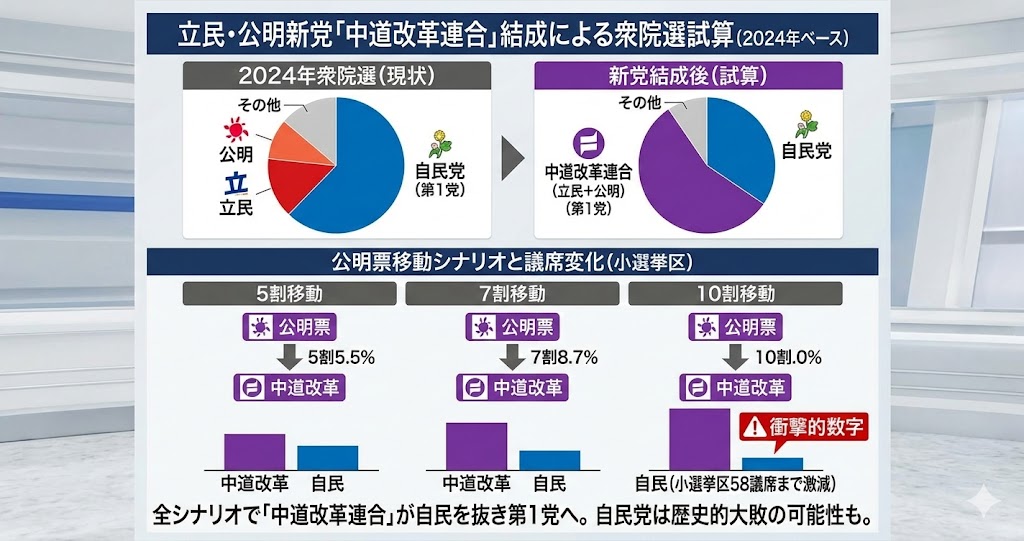 2024年衆院選のデータを基に、公明票が自民から立憲の候補に移った場合を試算したところ、公明票が比例区得票の5割移動するシナリオでも「中道改革」が149議席(自民89)となり、第1党になる結果となった。