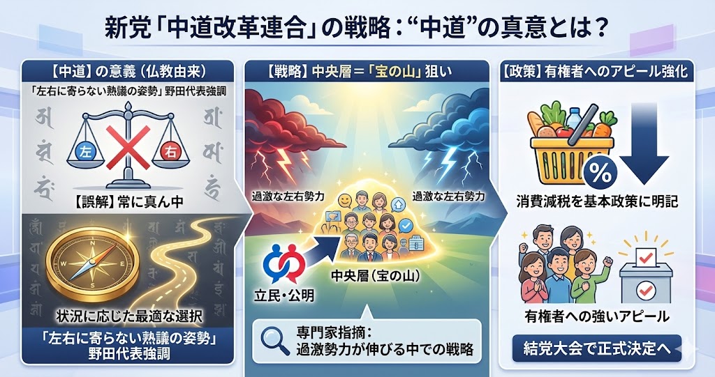 中道はもともと仏教に由来する言葉で、「それぞれに適した選択をする」ことであり「常に真ん中というわけではない」とされる。