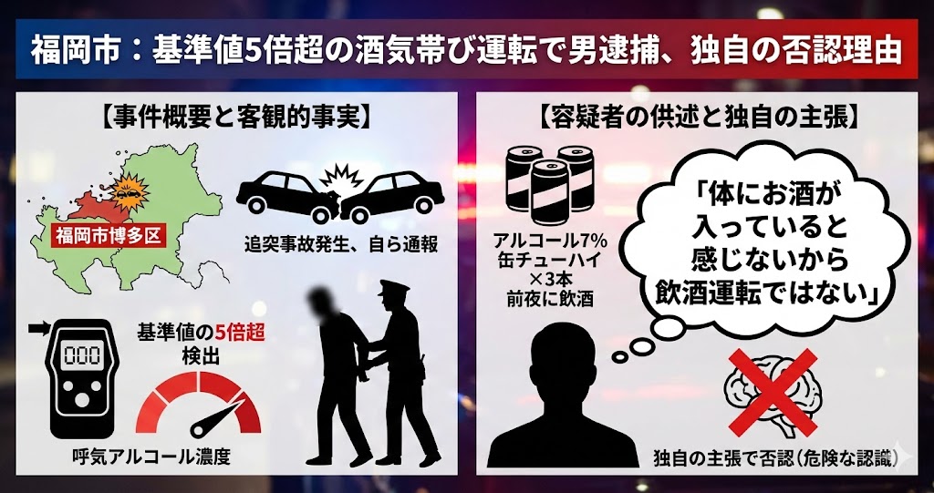 ・福岡市博多区で、自称会社員の男(48)が酒気帯び運転の疑いで現行犯逮捕。・追突事故を起こし自ら通報したが、呼気から基準値5倍超のアルコールを検出。