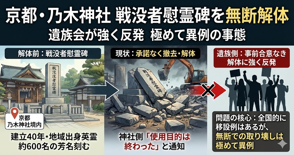 ・京都の乃木神社が、境内の戦没者慰霊碑を遺族会の承諾なく撤去・解体した。