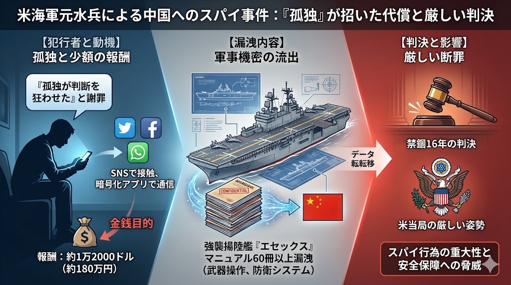 米連邦裁判所は、米海軍の艦船に関する機密情報を中国に売却したとして、元水兵のジンチャオ・ウェイ被告に対し、禁錮16年の実刑判決を言い渡した。強襲揚陸艦「エセックス」の技術者だった同被告は、2022年から約18ヶ月間にわたり、同艦の武器システムや航空機、デッキのリフトに関する技術マニュアル60冊以上、さらには艦船の所在地などの機密情報を中国の諜報員に提供した。この対価として、同被告は1万2000ドル(約180万円)以上を受け取っていたとされる。