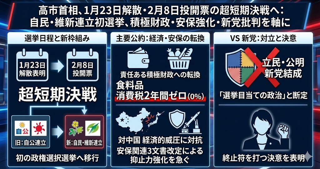 ・高市首相が1月23日の解散を正式表明し、2月8日投開票の超短期決戦へ。