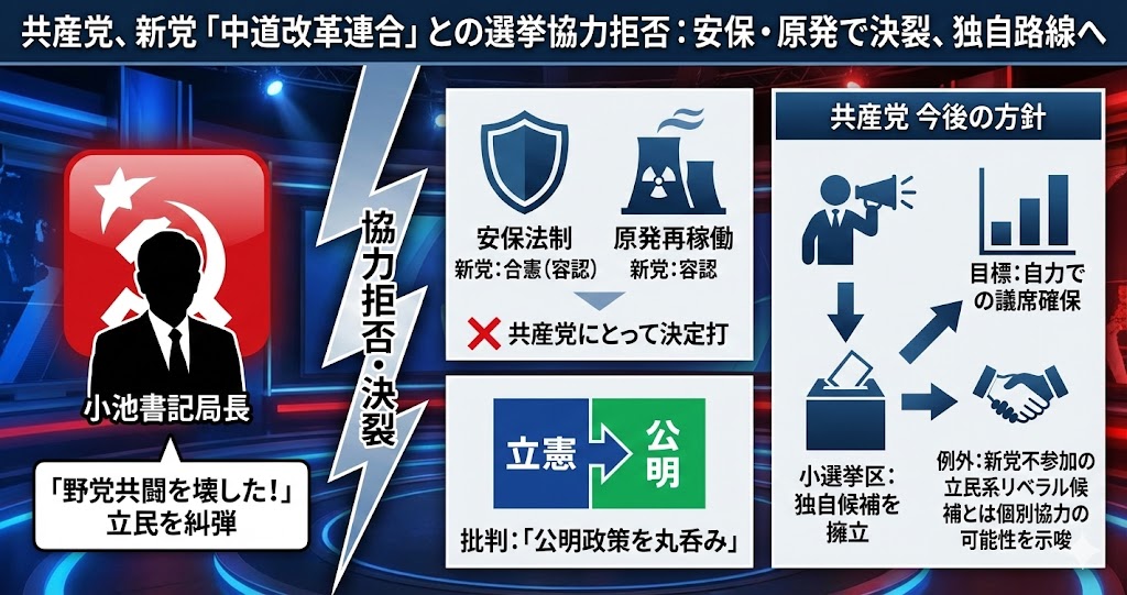 ・共産党の小池書記局長が、新党「中道改革連合」との選挙協力を拒否すると表明。・新党が安保法制を合憲とし、原発再稼働を容認したことが決裂の決定打となった。