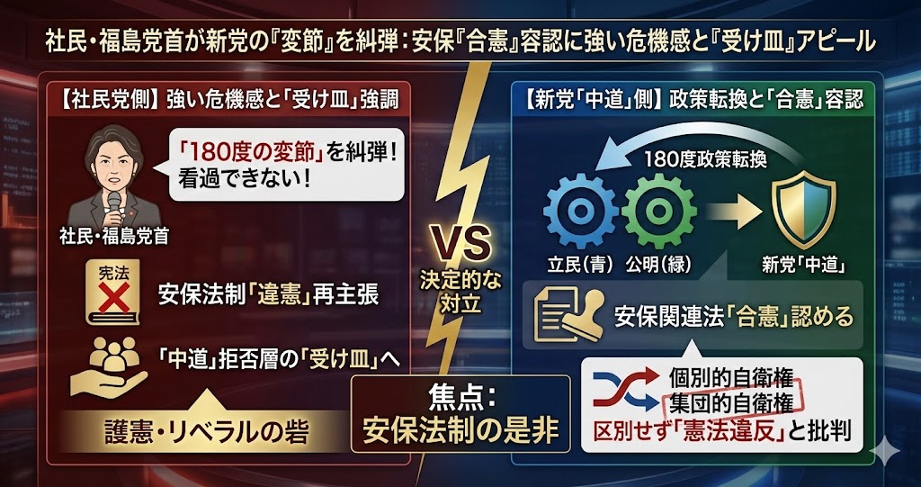 立憲民主党と公明党が19日、新党「中道改革連合」の綱領と基本政策を発表したことを受け、社民党の福島瑞穂党首は記者会見で「立憲民主党は180度変わった」と強く批判した。福島氏は、安全保障関連法を合憲とした新党の姿勢に対し、「10年前に憲法違反だったものが10年たって合憲になることはあり得ない」と強調。新党の政策に納得できない有権者に対し、「いけないと思う人はぜひ社民党に来てほしい」と呼びかけた。