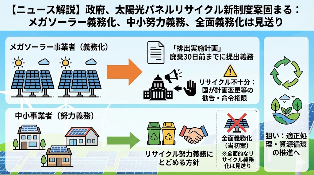 ・政府が太陽光パネルのリサイクルに関する新制度案を固めました ・メガソーラー事業者に対し、廃棄の30日前までに「排出実施計画」の提出を義務化します