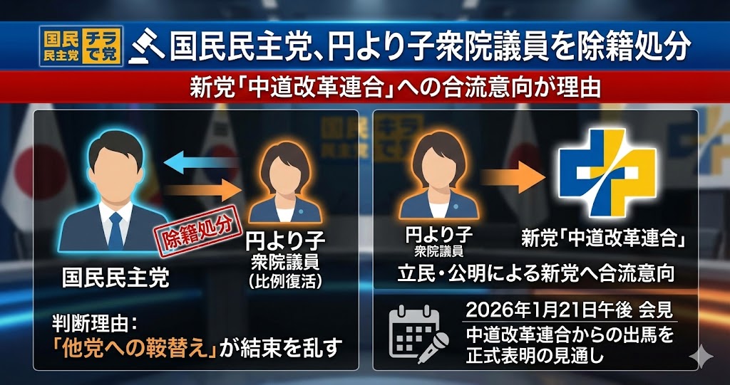 国民民主党は21日、次期衆院選で立憲民主党と公明党が結党した「中道改革連合」から立候補する意向を示している円より子衆院議員を除籍処分とした。「党の結束を乱す行為を行った」としている。円氏は2024年の衆院選で国民民主公認で立候補し、比例復活していた。党が16日に公表した候補予定者一覧に円氏の名前はなかった。