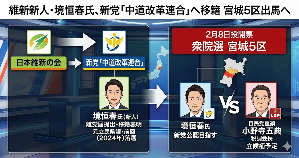 2月8日投開票の衆院選で宮城5区から立候補を予定している日本維新の会の新人境恒春氏(46)は21日、維新に離党届を提出した。境氏は元立憲民主党宮城県議。新党「中道改革連合」に移籍して出馬を目指すとしており、立民側と調整を進めている。宮城5区は、自民党の小野寺五典税制調査会長が立候補を予定している。境氏は2024年衆院選は宮城5区で維新から出馬し、落選した。