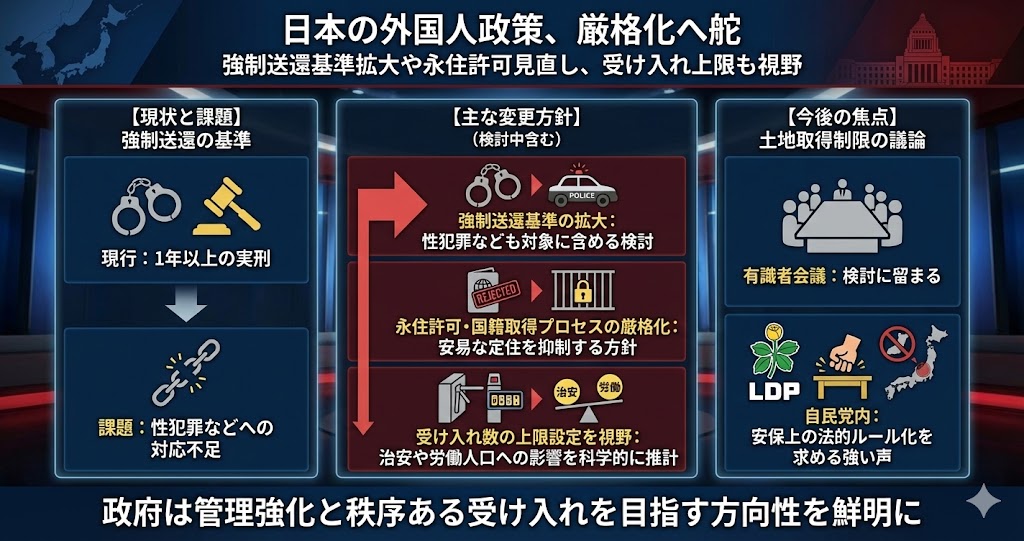 政府が検討している外国人政策の基本方針案の内容が20日に判明しました。現行では「1年以上の実刑」などに限定されている強制送還の対象犯罪を拡大し、実刑に至らない性犯罪者なども含める方向で調整が行われます。