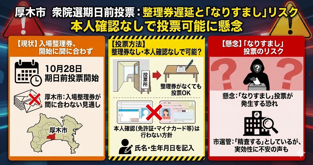 高市政権による電撃的な「最短解散」の影で、地方自治体の事務処理がパンク状態に陥っている実態が露呈しました。戦略的な早期解散は政権側の強みではありますが、このように選挙管理の現場で混乱が生じることは、民主主義のインフラが摩耗している証左でもあります。特に、整理券の遅れを理由に「本人確認なし」で投票を認めるという厚木市の判断は、公正な選挙を担保する観点から見て極めて危ういものと言わざるを得ません。