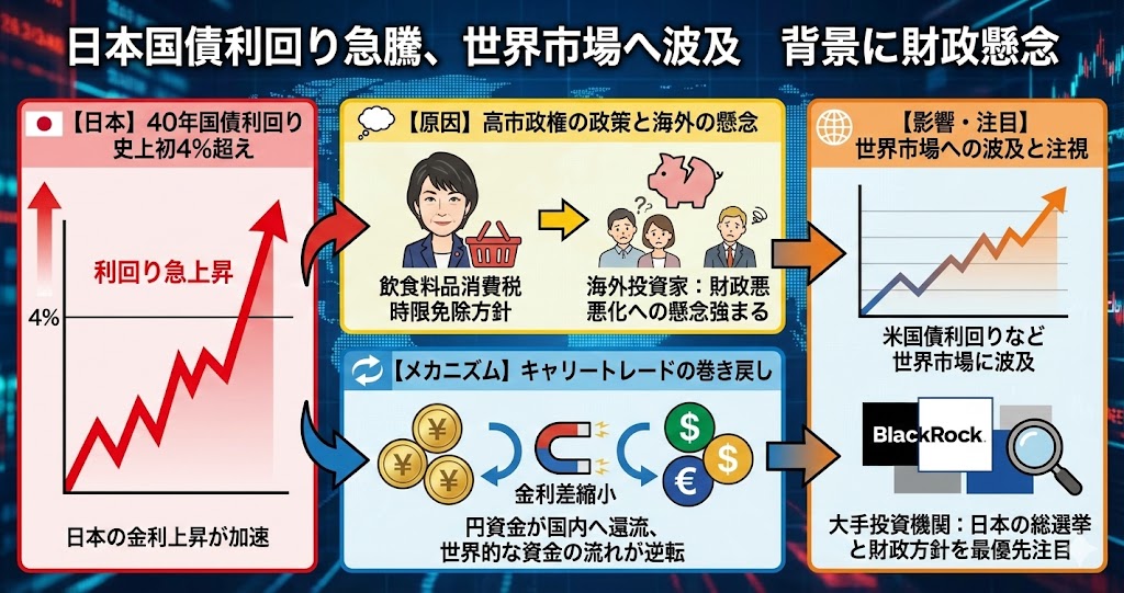 日本の40年物国債利回りは20日、前日の3.94%から4.2%へと急上昇し、史上初めて4%を突破した。この荒い値動きの背景にあるのは何か? 飲食料品に対する消費税の“一時停止”が検討されていることだ。ローゼンバーグ・リサーチのデビッド・ローゼンバーグ氏は「高市首相が食品にかかる消費税の時限免除を掲げて打って出た解散総選挙に対し、投資家がいかに否定的になっているかを浮き彫りにしている」と指摘した。ブラックロックのジャン・ボワバン氏は「今後数日間、日本で事態がどう展開するかが、投資家が注目すべき最優先事項だ」と言及している。