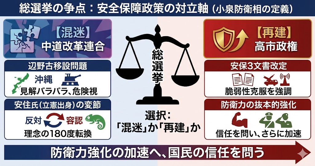 引用元: 【速報】小泉防衛相、攻撃に転じる「混迷か再建か。選択肢を問うものだ。新しい中道改革連合が政権を樹立すれば混迷の入口に立つ」