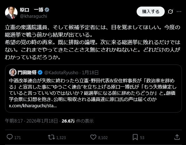 引用元: 【速報】元立憲幹部議員、中道議員に警鐘「ほぼ全員落選する。彼らは分かっているのだろうか?」