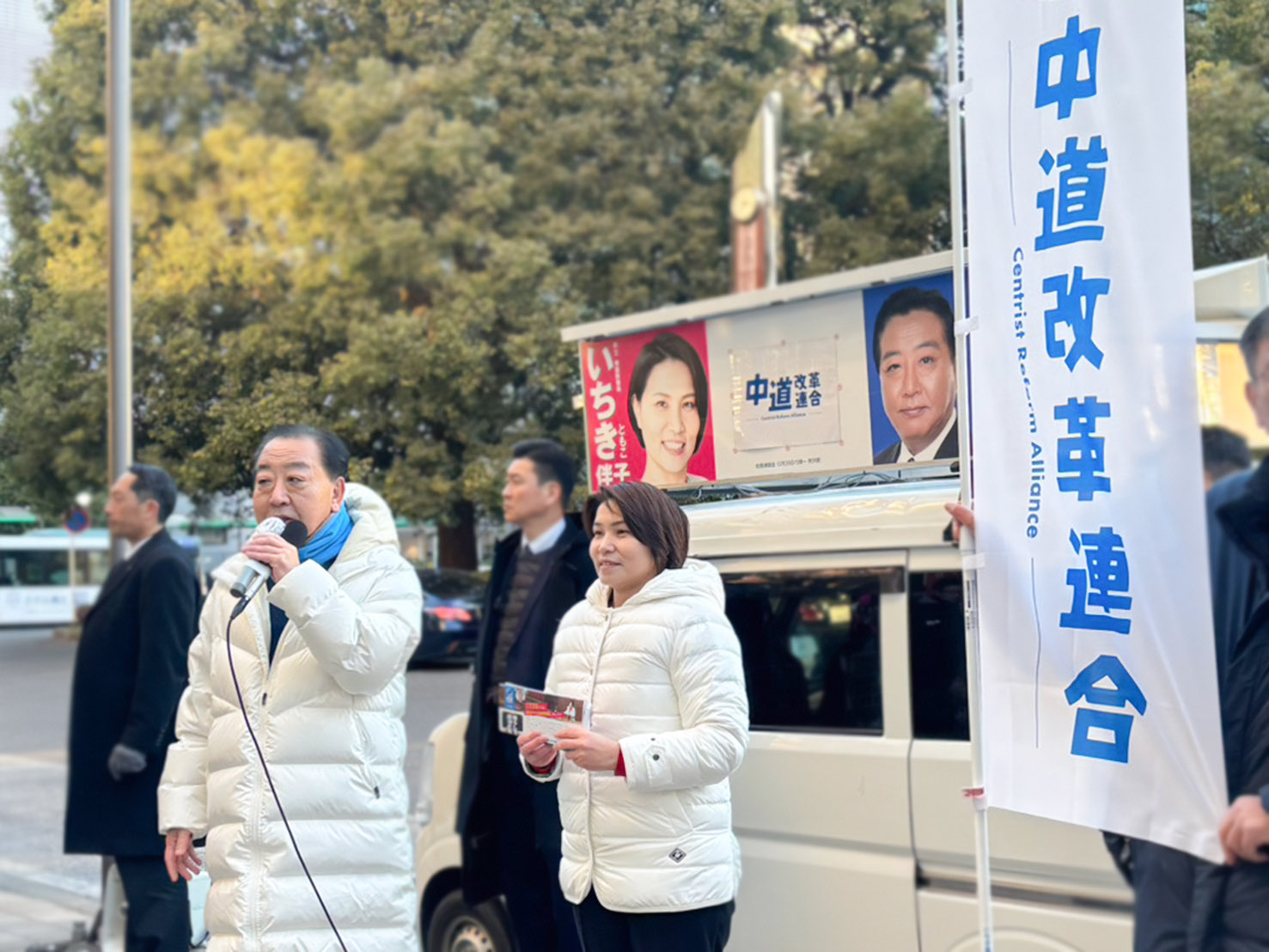 高市早苗首相の奇襲電撃的な衆院解散に対抗する形で結党した新党「中道改革連合」は23日、22日の結党大会後、初めての街頭演説を東京都内で開いた。