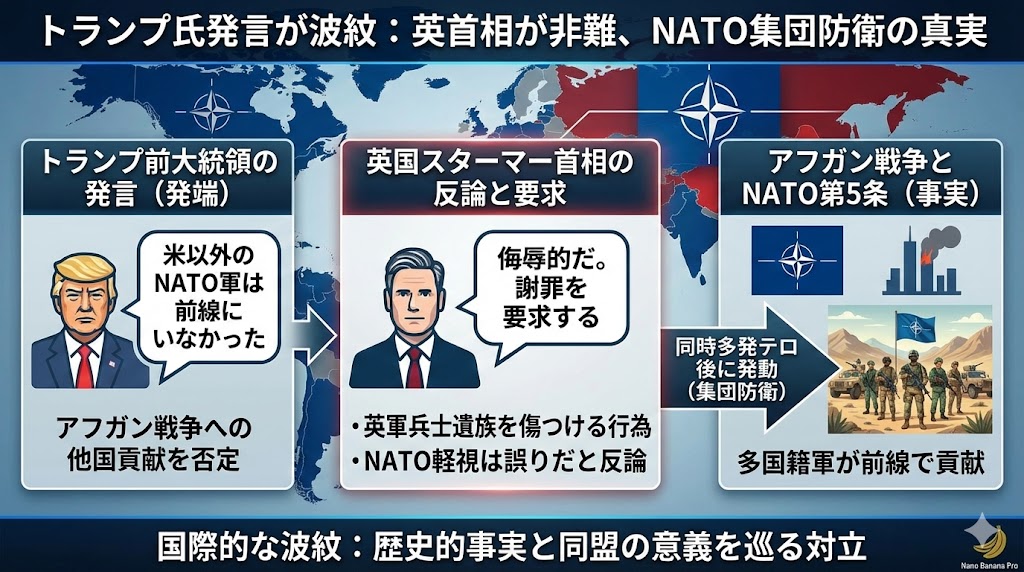 アメリカのトランプ大統領がアフガニスタン戦争で「アメリカ以外のNATO軍は最前線から離れていた」などと発言したことに対し、イギリスのスターマー首相は「侮辱的だ」と反論し、謝罪を求めました。