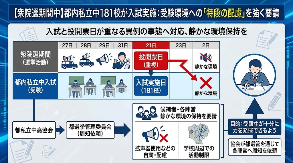 東京私立中学高校協会は23日付で、衆院選の候補者らに対し、入試期間中の静かな環境保持を求める要請を行った