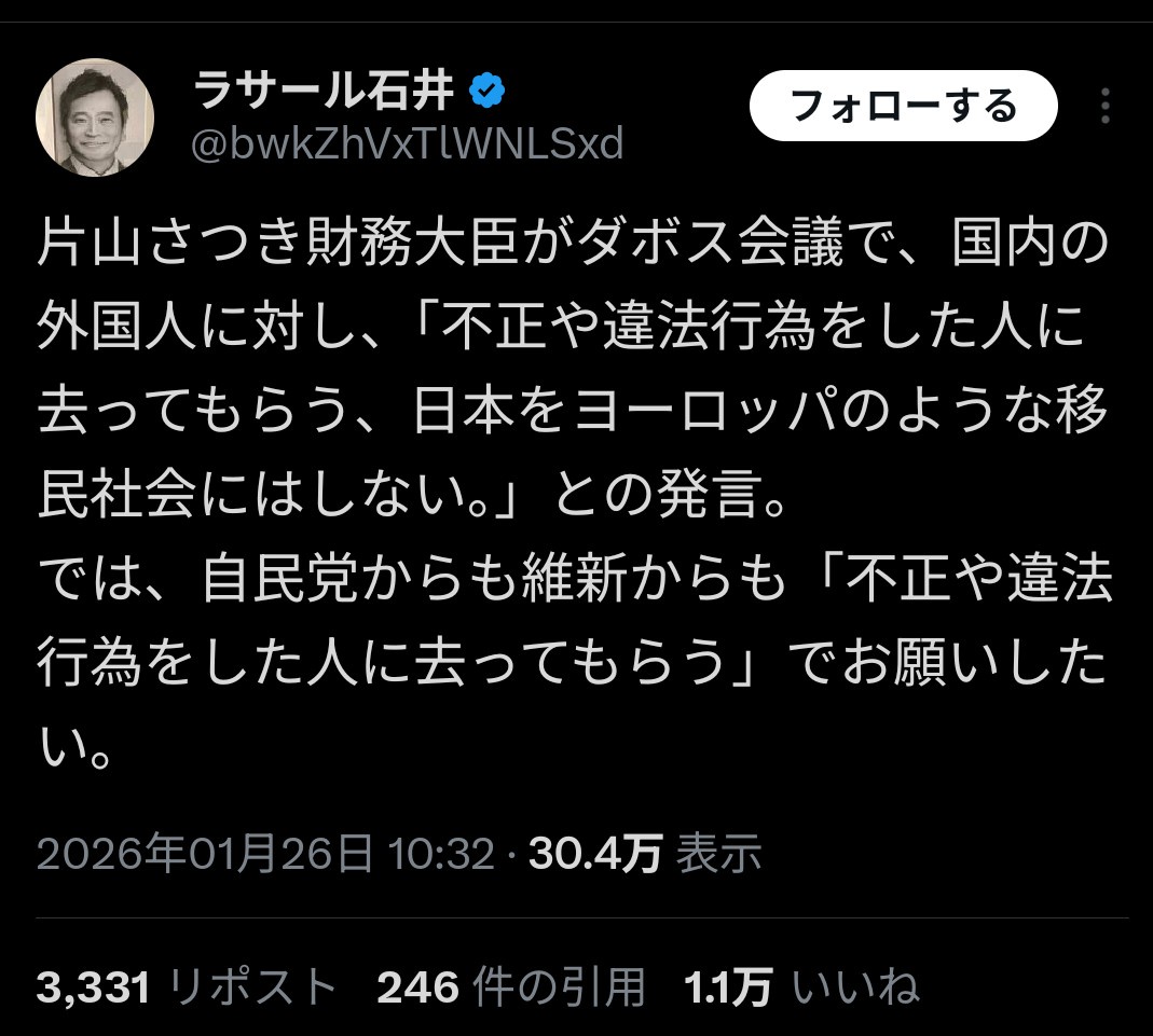 引用元: 【速報】【画像】片山さつき「不正した外国人は去れ!」→ラサール石井「不正した自民維新議員も去れ!」