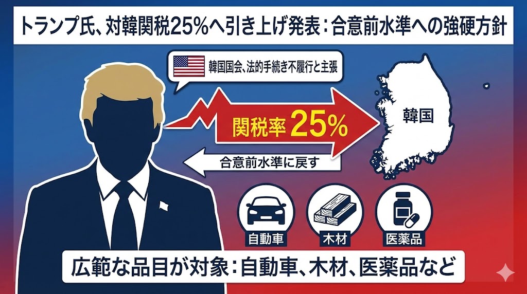 SNSへの投稿では「韓国立法府が合意を守っていない」と指摘しており、自動車や木材、医薬品などを含む全品目の相互関税を現行の15%から25%に引き上げる方針を明らかにしています。