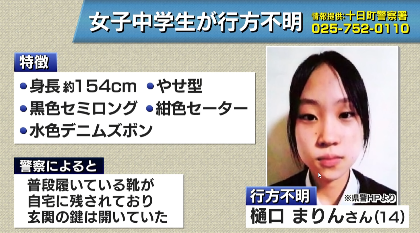 新潟県十日町市で中学3年生の樋口まりんさん(14)が26日夜から行方不明になっています。