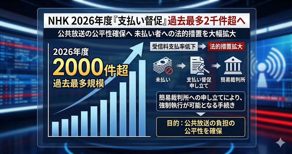 NHKは28日、受信料の支払率が低下している状況を受け、簡易裁判所を通じた「支払い督促」の申し立て件数が2026年度に2千件を超える見通しであると発表しました。この手続きは強制執行を可能にするもので、実現すれば過去最多の規模となります。支払いの公平性を確保するため、未払い者への法的措置を一段と強化する方針です。