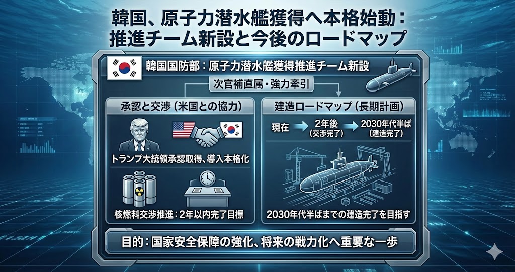 韓国国防部が原子力潜水艦建造のための担当組織「原子力潜水艦獲得推進チーム」を新設したことが28日、分かりました。軍当局者によると、同チームは現政権の任期中に事業を主導する組織として設置され、次官補が直接監理して長官に報告する方式で運営されます。韓国の原子力潜水艦導入は、昨年10月の韓米首脳会談でトランプ米大統領が承認したことで本格化しており、2030年代半ばまでの建造完了を目指す方針です。