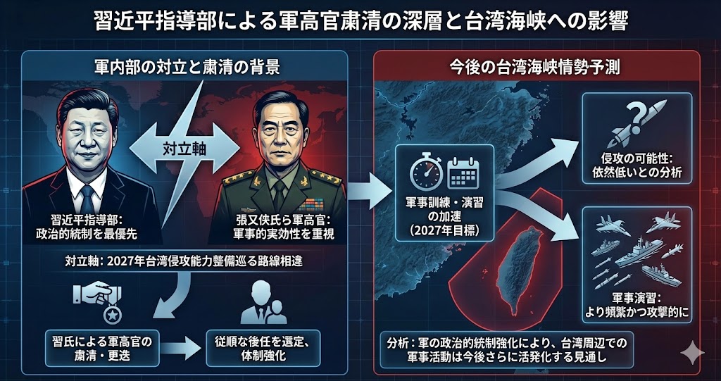 分析によれば、張氏らは習氏が求める「2027年までの台湾侵攻能力の実現」というスケジュールに対し、より長期的な2035年を見据えた統合作戦能力の強化を優先していたことが対立の一因とみられます。習氏は今後、より従順な後任を据えて軍事演習を加速させる可能性が高いものの、短期間での侵攻能力実現は極めて困難であると予測されています。