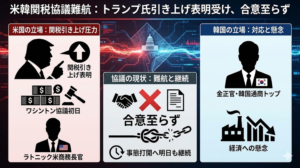 トランプ米大統領による対韓関税引き上げ表明を受け ワシントンの米商務省で開かれた直接協議の初日は合意に達しませんでした 。