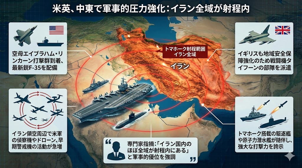 オープンソースの追跡や衛星写真により、中東地域に米英軍の戦力が急速に集結している実態が判明しました。米空母エイブラハム・リンカーン打撃群が到着し、F-35ステルス戦闘機やトマホーク搭載駆逐艦が展開。イラン領空付近ではP-8偵察機やドローン、早期警戒機が活発に活動しています。軍事専門家は、現在の態勢について「最深部の地下施設を除き、イラン国内のほぼあらゆる場所を攻撃可能」と分析しており、緊張が極限まで高まっています。