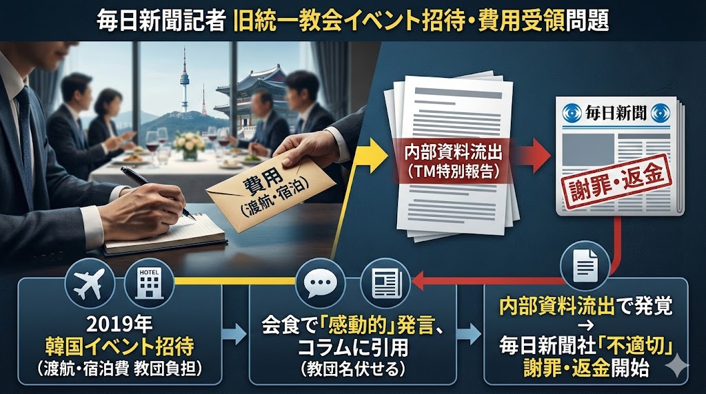 毎日新聞社は30日、同社の記者が2019年に世界平和統一家庭連合(旧統一教会)関連のイベントに参加し、渡航費や宿泊費を主催者側に負担させていたとしておわびを発表しました。教団の内部資料とされる「TM特別報告」の記載から発覚したもので、記者は会食の場で「感動的な機会でした」と発言していたことも判明。同社は「不適切だった」として、費用を返金する手続きを進めています。