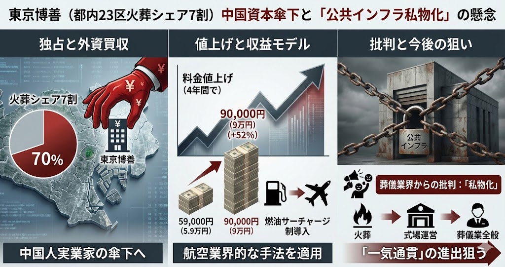 東京23区内の火葬事業の7割超を握る「東京博善」が、中国人実業家・羅怡文氏グループの傘下に入った後、火葬料金を大幅に値上げしています。標準クラスの「最上等」料金は、2021年の5万9000円から、2024年には9万円へと約52%増額されました。公共性の高いインフラである火葬場が「経済合理性」を優先し、外資による収益化の対象となっている現状に対し、葬儀業界やメディアから強い反発の声が上がっています。
