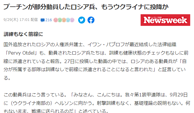 ロシアのウラジーミル・プーチン大統領が9月21日に出したばかりの「部分動員令」で5日前に招集された兵士が、早くもウクライナ軍に投降したらしいことが分かった。